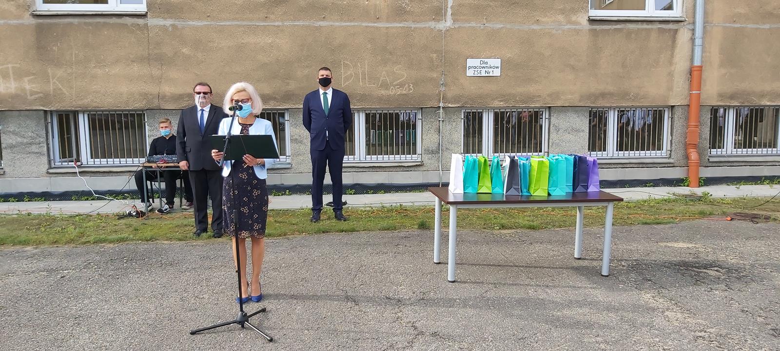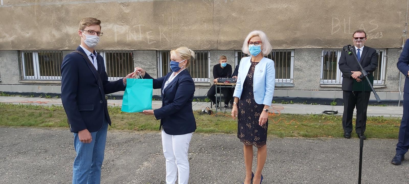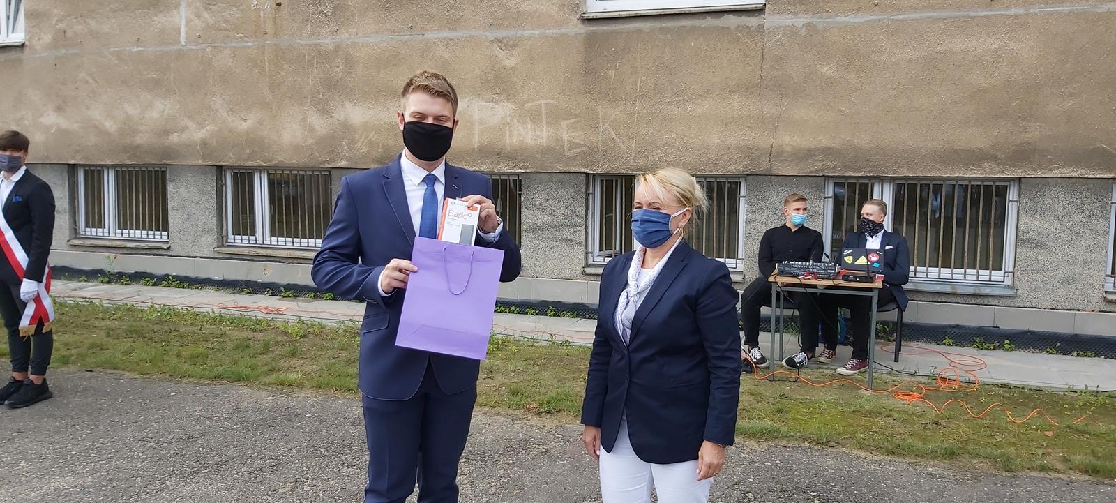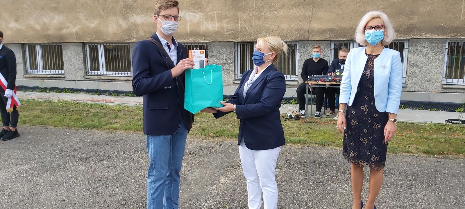 Świadomi zagrożeń związanych z pandemią, ale też pełni radości na spotkanie z dawno niewidzianymi kolegami i nauczycielami rozpoczęliśmy kolejny rok wyzwań edukacyjnych. Od rana po samo południe szkolny dziedziniec wypełniał harmider przybywającej na uroczystość młodzieży. Śmiejące się oczy młodych techników zdradzały ich gotowość do rzucenia się w wir nauki i pasji oraz podjęcia walki o realizację zawodowych marzeń wbrew przeciwnościom losu. Po przemówieniu Pani Dyrektor Małgorzaty Grzemskiej inspirującym do przyjęcia odważnej i odpowiedzialnej postawy uczniowskiej skierowała ona słowa uznania do osób wyróżnionych za zeszłoroczne sukcesy.