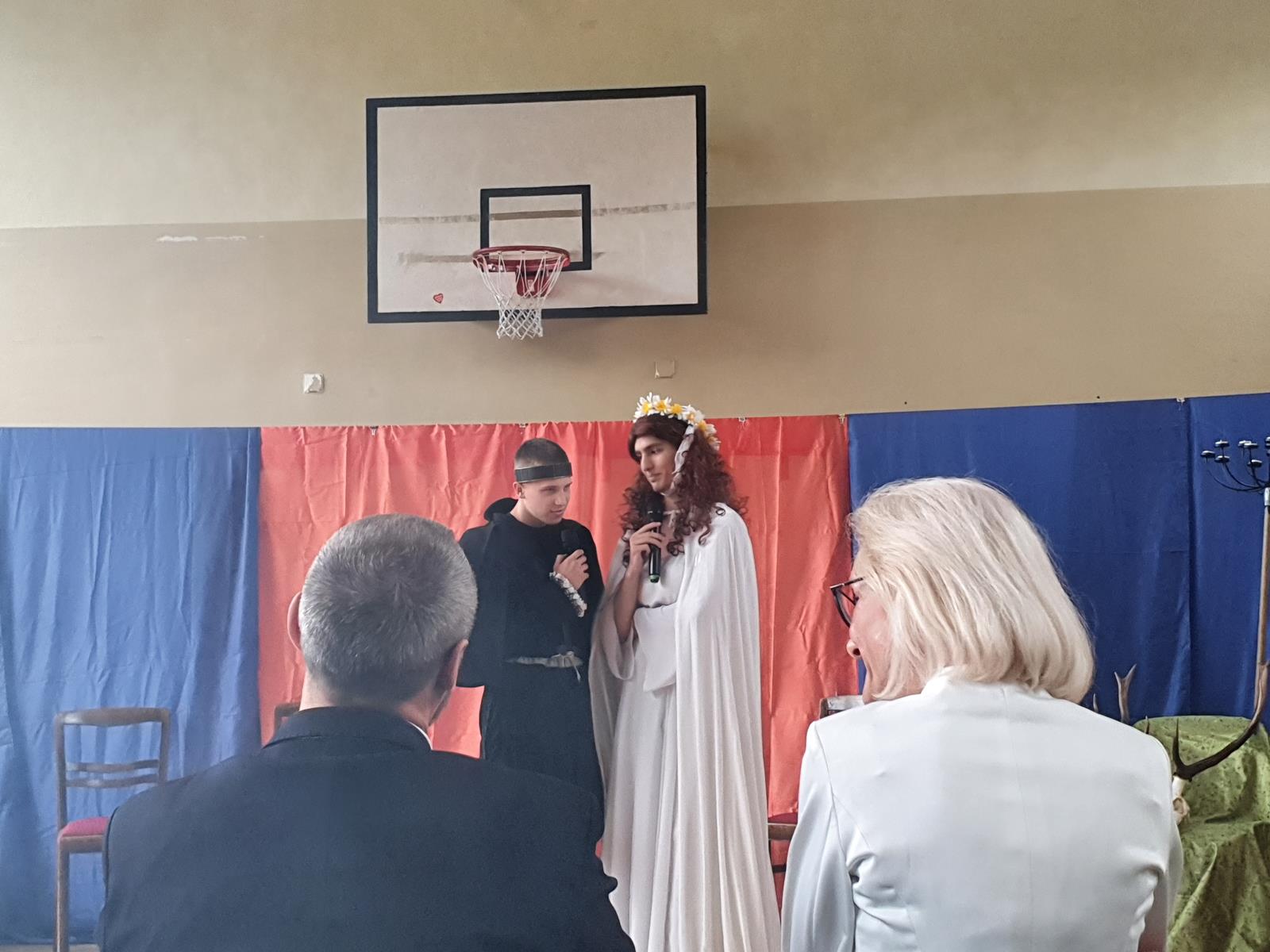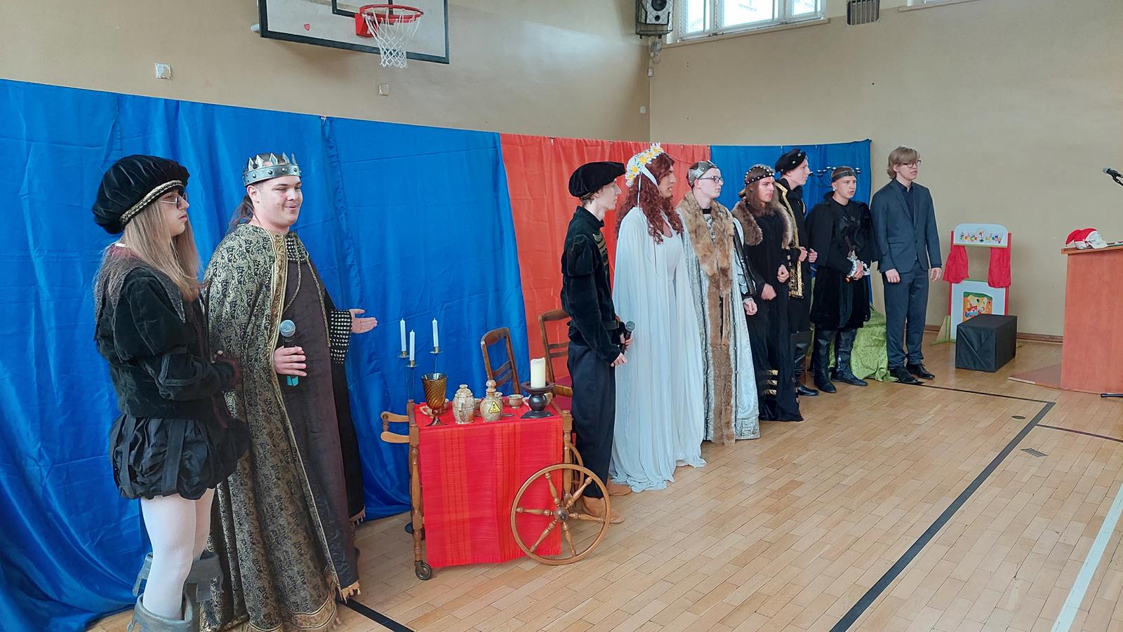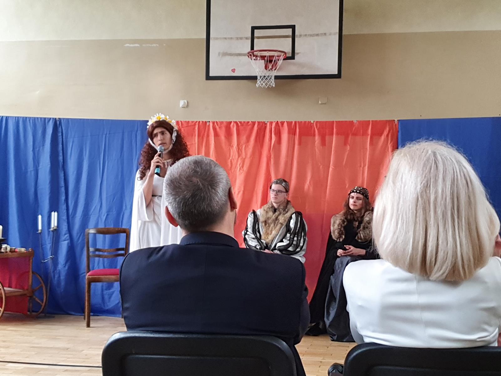 W murach szkoły zagościł szekspirowski bohater …na wesoło . Młodzież zaprezentowała swój talent i zaangażowanie w ,,Trudnych sprawach Hamleta’’. Młodzi aktorzy mieli okazję wystąpić w oryginalnych strojach z przedstawienia ,,Makbet’’, które gościło na scenie poznańskiego Teatru Wielkiego.