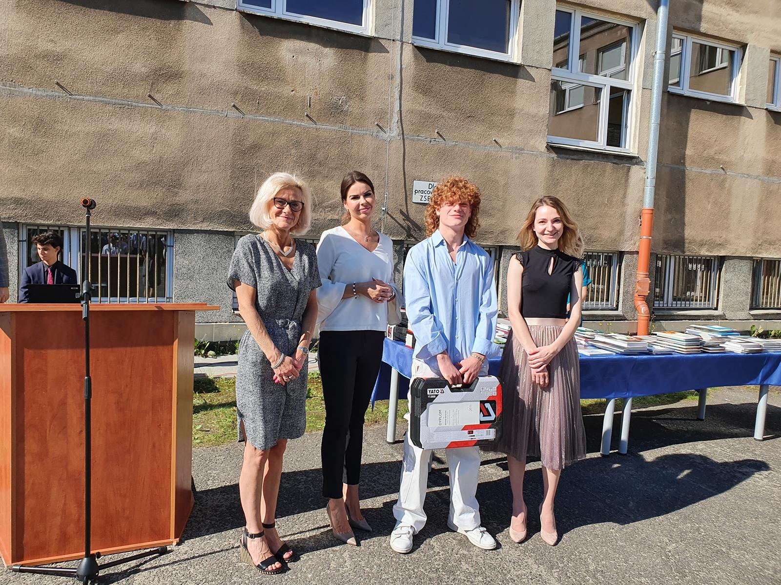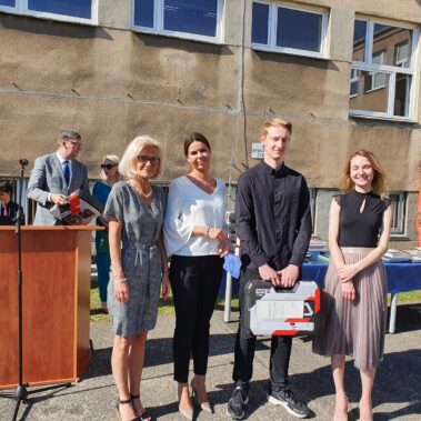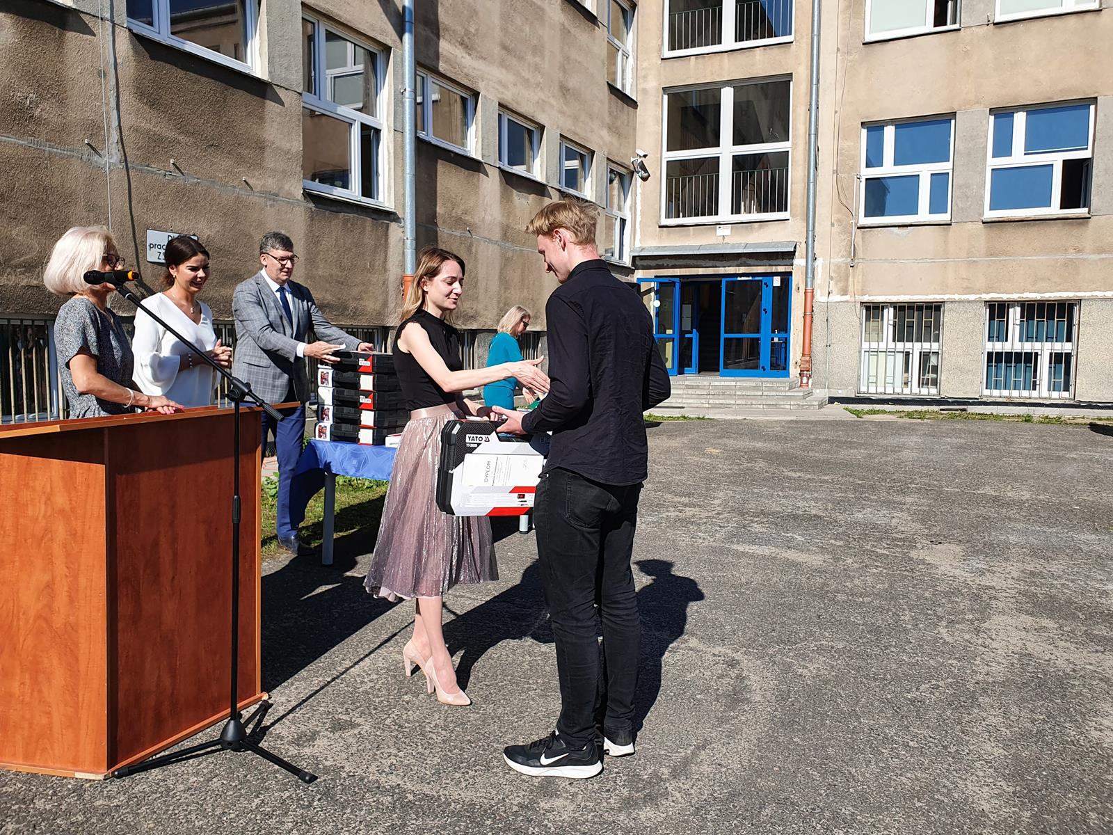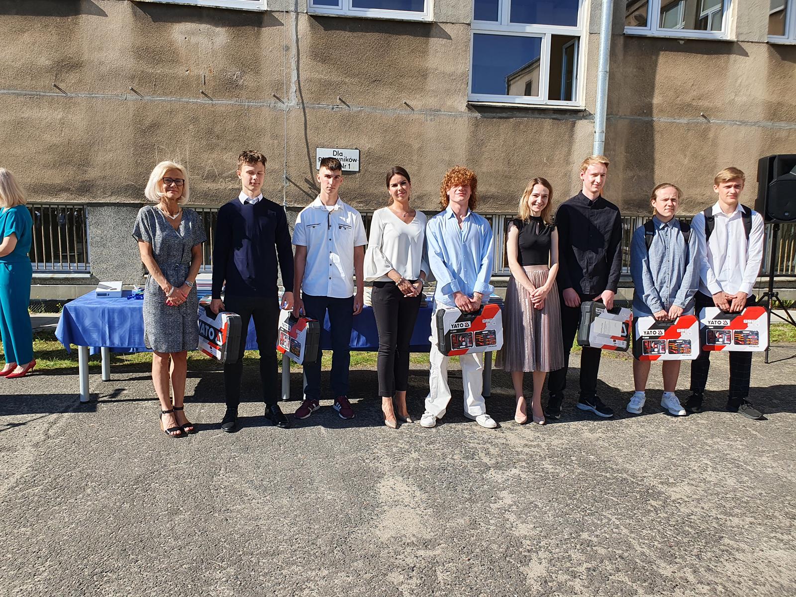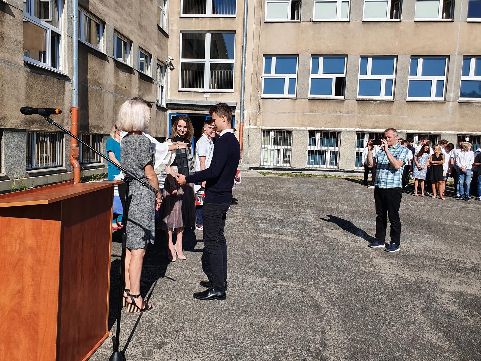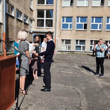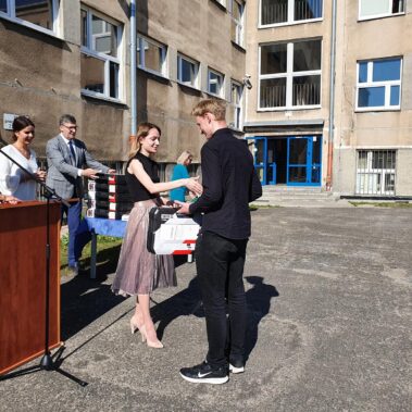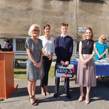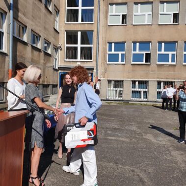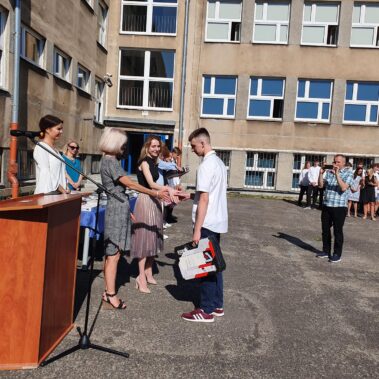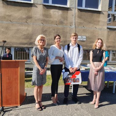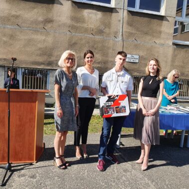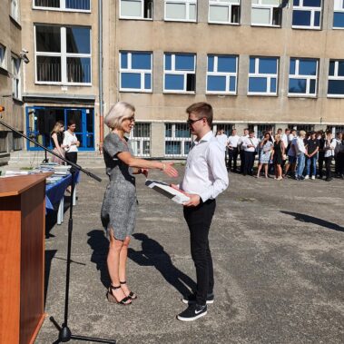 Kończący się rok szkolny to, jak co roku, okazja do radości i refleksji. Mimo trudnych czasów dla nas wszystkich, mijający rok zaowocował wieloma sukcesami i aktywnościami. Świadectwem tego niech pozostanie liczne grono nagrodzonych uczniów, którzy swoje sukcesy zdobywali na różnych polach, bądź to zawodowych, bądź osiągając najlepsze wyniki w nauce. Uczniowie godnie reprezentowali Szkołę uczestnicząc w programie „Trwała pamięć pokoleń” i wyruszając śladami Polaków na kresach. Rozwijali wiedzę z zakresu historii nie tylko tej dawnej, ale i najnowszej – odwiedzając m.in. Westerplatte, Stocznię Gdańsk, uczestnicząc w ważnych uroczystościach rocznicowych upamiętniających istotne wydarzenia dla naszego kraju. Pamiętali o uroczystej oprawie dnia patrona wykazując talenty aktorskie oraz zgłębili tajniki kryptologii odwiedzając Centrum Szyfrów Enigma. W ramach współpracy z Poznańskim Centrum dziedzictwa zrealizowali projekt „Na tropie Enigmy” przygotowując mobilną grę edukacyjną. Z racji zawodowego charakteru Szkoły uczniowie doskonalili umiejętności branżowe angażując się w projekt „Szkoła wodorowa”, czy próbując swych sił na Poligonie Energetycznym w Łagowie. Rozwijali kompetencje kluczowe poprzez udział w projektach unijnych Erasmus +, prowadzonych wspólnie ze szkołami partnerskimi z Portugalii, Włoch, Turcji i Bułgarii. Młodzież często wykazywała się wrażliwością, włączając się w liczne akcje wolontariackie, w tym pomoc uchodźcom z Ukrainy. Pani Dyrektor podkreśliła promowanie Szkoły w środowisku lokalnym, podziękowała Organowi prowadzącemu, firmom patronackim, współpracującym ze Szkołą uczelniom wyższym, Radzie Rodziców za wspieranie przedsięwzięć naszego Technikum. Zwieńczeniem uroczystości było rozdanie nagród, w tym tych specjalnych zasponsorowanych przez Fundację ENEA. Wręczyły je: pani Katarzyna Wiśniewska, Kierownik Biura Rekrutacji i Promocji Pracodawcy w Departamencie Rozwoju Zasobów Ludzkich Enea Operator oraz pani Klaudia Strzelecka – Kierownik Biura Promocji Pracodawcy Enea S.A. Gratulujemy wszystkim nagrodzonym!